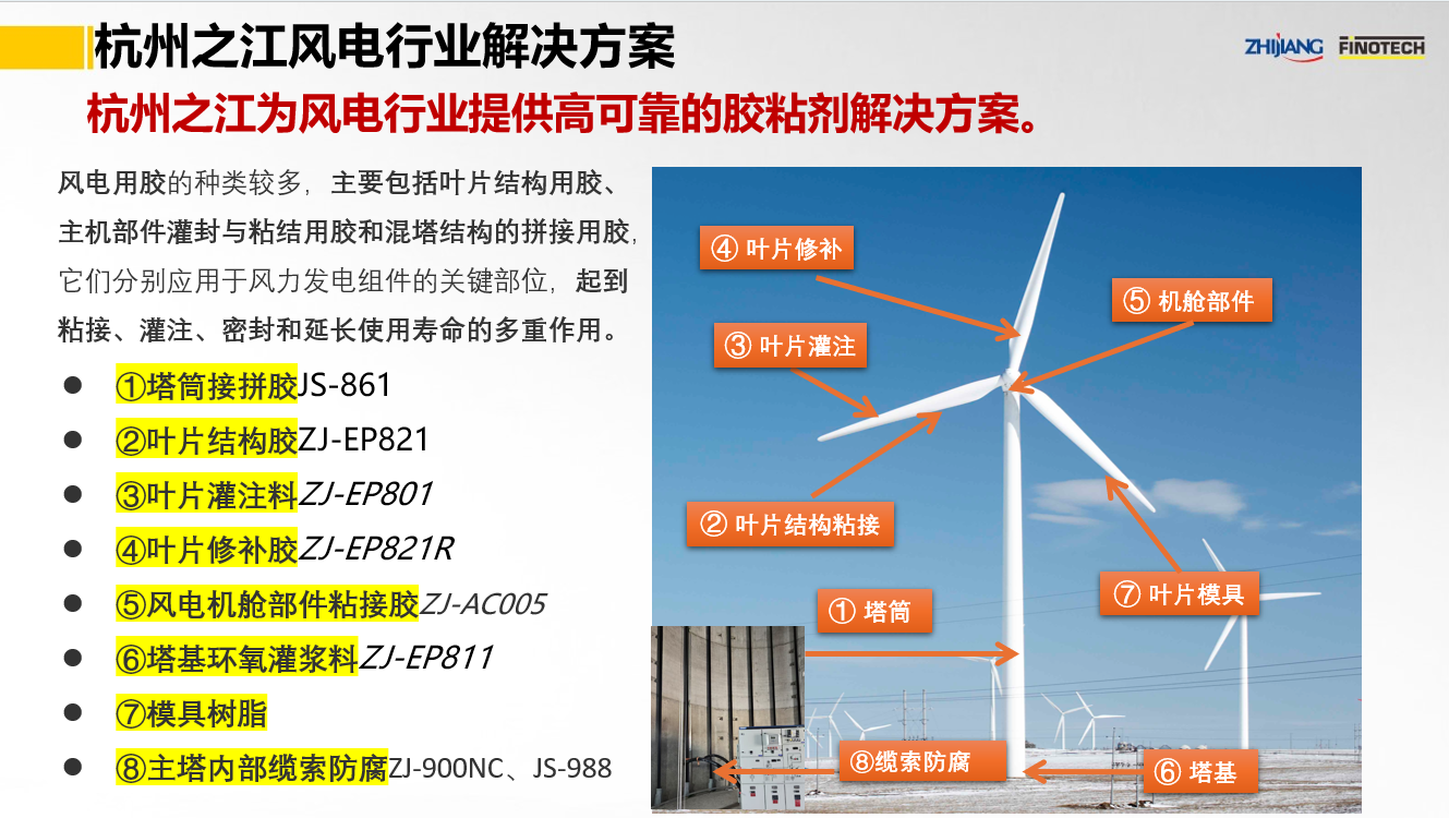 之江公司立足于中國膠粘劑行業(yè)領軍企業(yè)和有機硅、聚氨酯、環(huán)氧等專業(yè)膠粘劑的產(chǎn)業(yè)化優(yōu)勢,具有國家級高新技術企業(yè)和國家級企業(yè)技術中心資質(zhì),依靠國家級CNAS實驗室以及國家級博士后科研工作站,并有國際專家助力,為風電行業(yè)提供高性能的粘結(jié)密封解決方案。其中,關鍵產(chǎn)品如下: